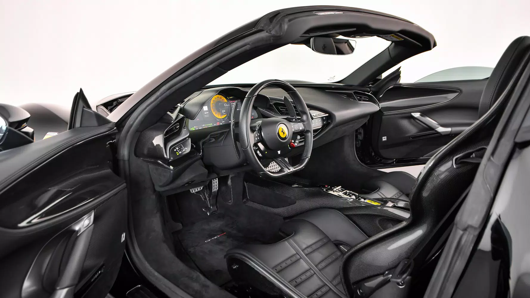 Where Power Meets Elegance: The black Ferrari SF90 Spider is a statement of dominance and design, merging cutting-edge hybrid technology with unmistakable Ferrari allure. Its 986 horsepower (735 kW) powertrain launches you from 0 to 100 km/h in just 2.5 seconds, delivering an electrifying blend of instant torque and V8 ferocity. With its retractable hardtop, the SF90 Spider transforms every journey into an open-air performance of precision and prestige. Bold, refined, and unmistakably Ferrari—this is power dressed in black.